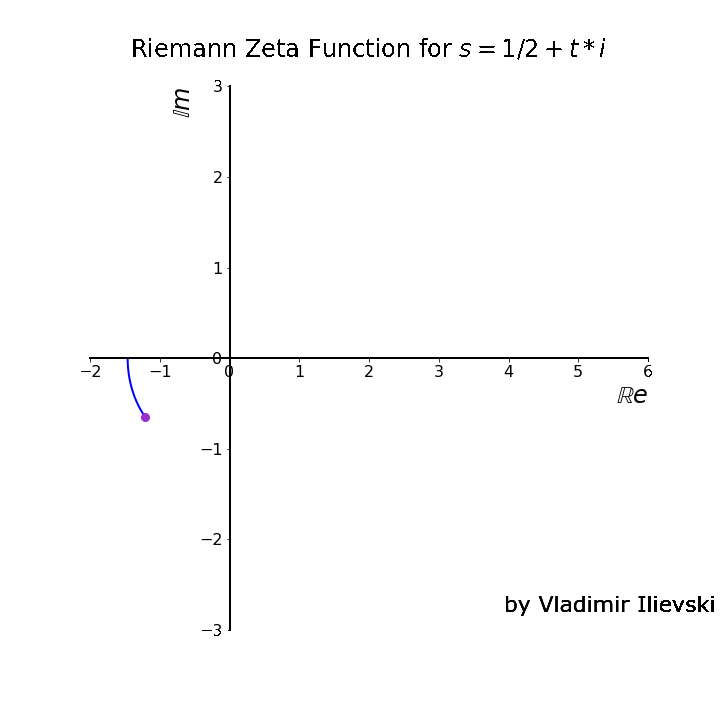 Usando Python y matplotlib se genera una animación que muestra la funciona Zeta de Riemman en coordenadas polares, en la grafica se muestra como la grafica función interseca con el eje 1/2+ti , puntos que son los primeros ceros no triviales de la funcion Zeta.